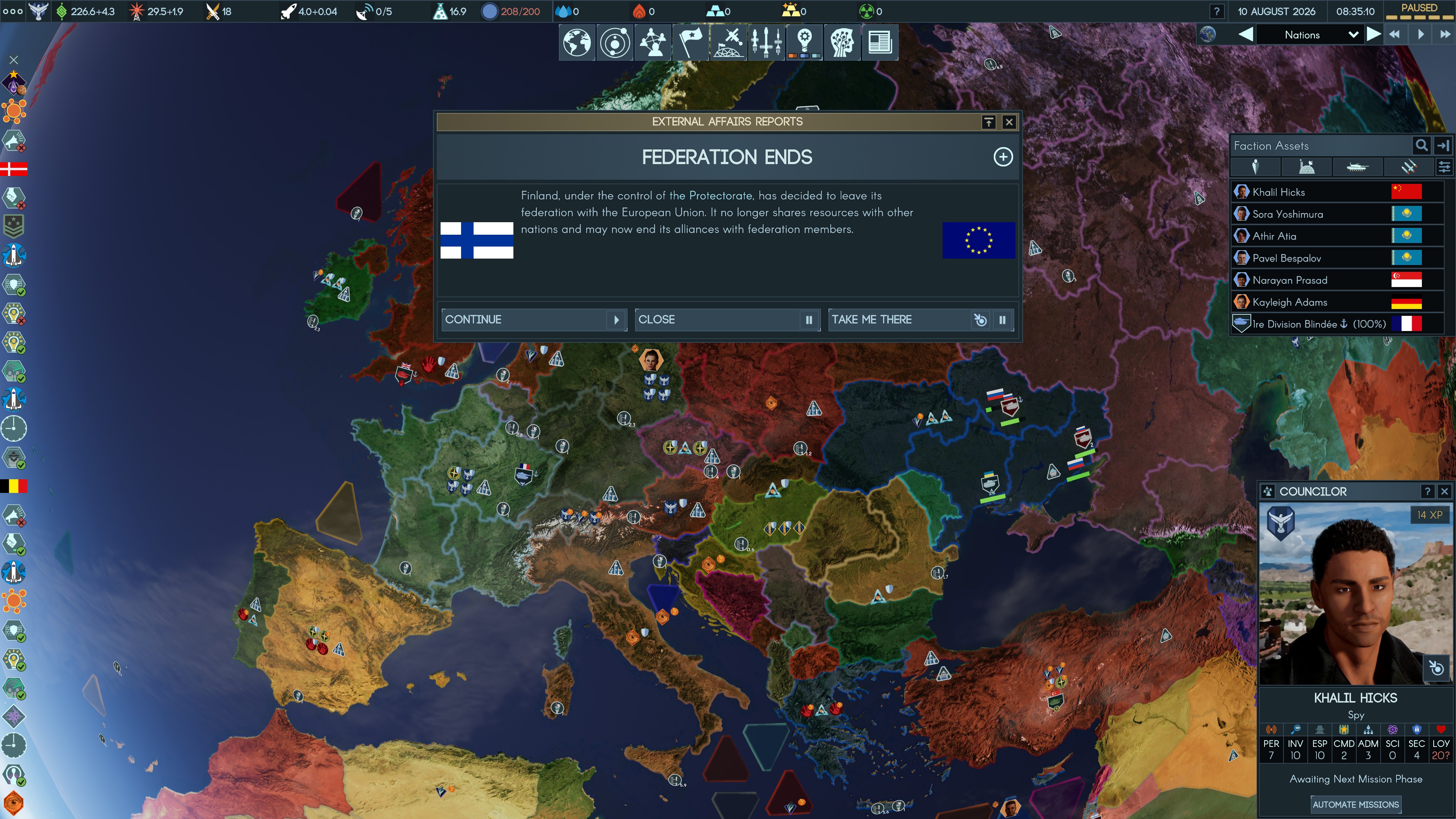 Counciloreiksi kutsutut agentit ovat yksilöitä, joiden taidot vaihtelevat laajasti – kukaan ei kykene tekemään kaikkia mahdollisia toimintoja. Hahmot voivat valloittaa valtioita, vaikuttaa niiden politiikkaan, sabotoida muita faktioita ja ohjata pelaajan strategisia painosuuntia lukuisilla tavoilla. He keräävät myös kokemusta, kehittyen sitä kautta vahvemmiksi.