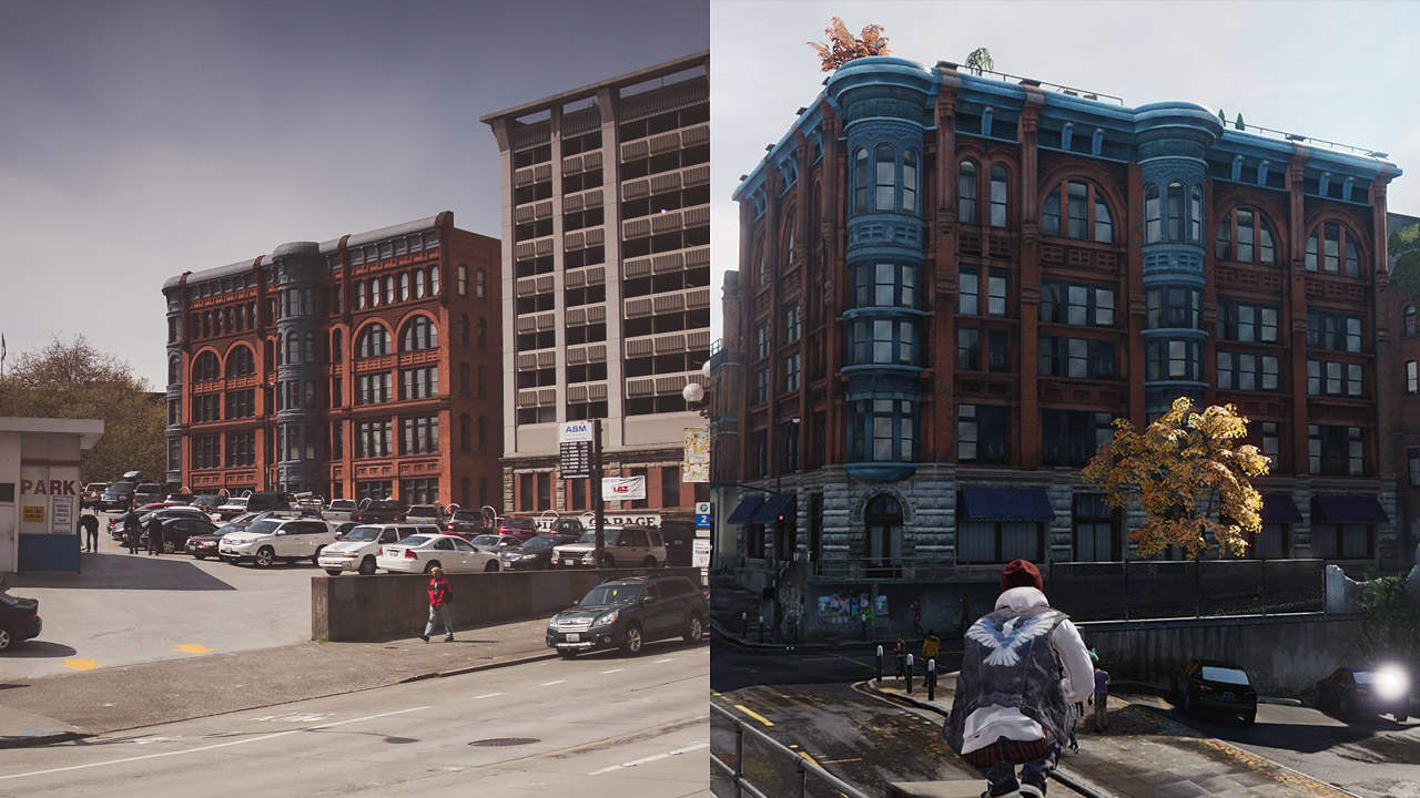 Alta löytyvissä kuvissa nähdään kuvankaappaus pelistä ja sama paikka todellisuudessa. Kuvista voi bongata Sonic Boom -levykaupan, legendaarisen Space Needlen, paikallisen junan, vihreän taksin ja muutaman muun asian.